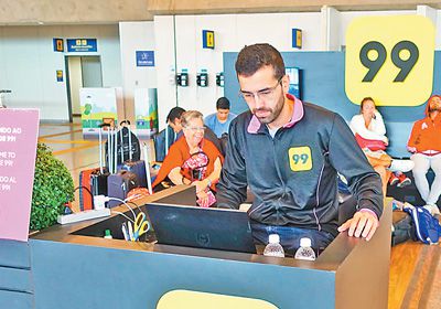 巴西里约热内卢国际机场设有99公司服务区,供乘客在此叫车等候。图为正在工作的99公司员工。