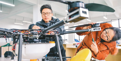 图为某飞行器技术公司的技术人员对该公司自主研发的新型智能农用植保无人机进行调试。谭云俸 摄