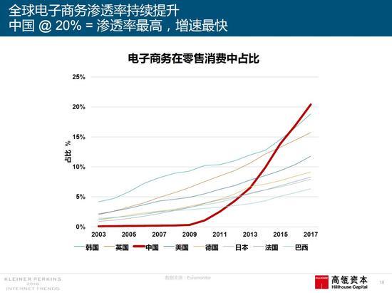 电子商务进一步发展,在全球电子商务渗透率持续提升的背景下,中国市场的渗透率瞩目,增速最快,以阿里巴巴盒马鲜生和高瓴投资的百丽集团为代表的线上线下整合,通过科技创新赋能传统行业的新模式正在重构零售市场的体验。