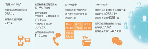 为更加精准打击网络侵权盗版,国家版权局等单位连续开展“剑网行动”,仅“剑网2017”就关闭侵权盗版网站2554个,删除侵权盗版链接71万条。工信部积极开展电信网络诈骗治理,截至今年8月,累计处置诈骗电话3.39亿次,及时劝阻受害用户36.9万人,挽回直接经济损失达11.2亿余元。“净网”“秋风”“护苗”等系列专项治理行动,使危害网络诚信的多种违规违法行为得到有效遏制。