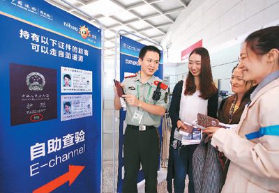 旅客在扬州泰州国际机场边检站民警指导下自助通关。孟德龙 摄(人民图片)