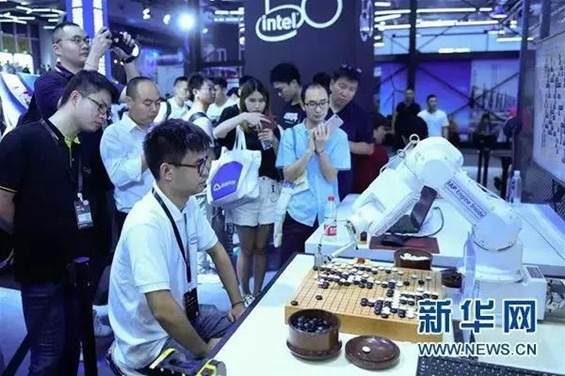 2018杭州·云栖大会上,参会者在大会展厅观看“天壤”围棋机器人现场对弈。新华社记者 黄宗治 摄