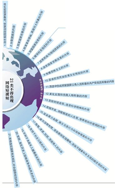 《规范》和《细则》针对网络视听领域存在的不足和薄弱环节,分别对开展短视频服务的网络平台以及网络短视频内容审核的标准进行规范。《细则》明确了21类、100项内容,“丧文化”“一夜情”“非主流婚恋观”等都不得出现在短视频中。