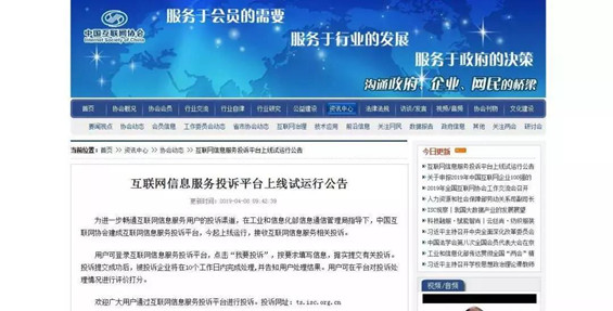 4月8日,中国互联网协会建成互联网信息服务投诉平台上线运行,网友可在线进行互联网信息服务相关投诉。目前涵盖包括阿里巴巴、百度、滴滴、今日头条、京东、美团、腾讯、唯品会、携程、新浪、支付宝等11家企业。