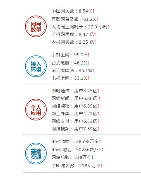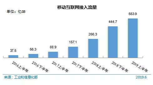截至2019年6月,我国网民规模达8.54亿,较2018年底增长2598万,互联网普及率达61.2%,较2018年底提升1.6个百分点;我国手机网民规模达8.47亿,较2018年底增长2984万,网民使用手机上网的比例达99.1%,较2018年底提升0.5个百分点。与五年前相比,移动宽带平均下载速率提升约6倍,手机上网流量资费水平降幅超90%。“提速降费”推动移动互联网流量大幅增长,用户月均使用移动流量达7.2GB,为全球平均水平的1.2倍;移动互联网接入流量消费达553.9亿GB,同比增长107.3%。