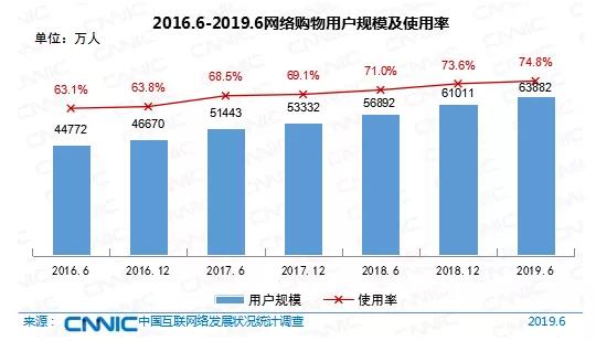 截至2019年6月,我国网络购物用户规模达6.39亿,较2018年底增长2871万,占网民整体的74.8%。网络购物市场保持较快发展,下沉市场、跨境电商、模式创新为网络购物市场提供了新的增长动能:在地域方面,以中小城市及农村地区为代表的下沉市场拓展了网络消费增长空间,电商平台加速渠道下沉;在业态方面,跨境电商零售进口额持续增长,利好政策进一步推动行业发展;在模式方面,直播带货、工厂电商、社区零售等新模式蓬勃发展,成为网络消费增长新亮点。