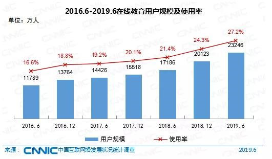 截至2019年6月,我国在线教育用户规模达2.32亿,较2018年底增长3122万,占网民整体的27.2%。2019年《政府工作报告》明确提出发展“互联网+教育”,促进优质资源共享。随着在线教育的发展,部分乡村地区视频会议室、直播录像室、多媒体教室等硬件设施不断完善,名校名师课堂下乡、家长课堂等形式逐渐普及,为乡村教育发展提供了新的解决方案。