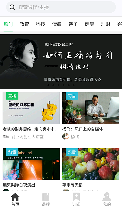 手播课是在去年由成都铼看科技有限公司推出的,这是一款完全基于移动设备的知识分享视频直播工具,可以实现传递知识文档、直播视频图像、在线连麦及时互动沟通等。“比如说我有一个实用的技巧,就可以拍成一个视频与其他人分享”,杜彬介绍说。目前在手播课的APP上我们可以看到有教育、科技、情感、亲子、健康、理财、兴趣等板块,各个板块下的内容由分享人决定在观看时是否需要付费以及付费的定价,分享前需提前发布预告,在结束后则可以观看回放。