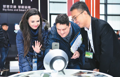参观者在第四届世界互联网大会·互联网之光博览会上通过家庭智能终端与家庭医生在线交流