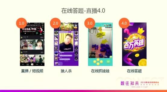 “答题是直播形式的延续,可以叫作直播4.0。”权静表示,直播的发展可以分成四个阶段,“直播1.0就是直播和短视频,去年开始火爆的狼人杀是直播2.0的形式,在线抓娃娃是直播3.0”,她认为,未来将会有更多与直播技术相结合的热点出现,这些热点将围绕着泛娱乐、电商、内容(知识付费)等领域。