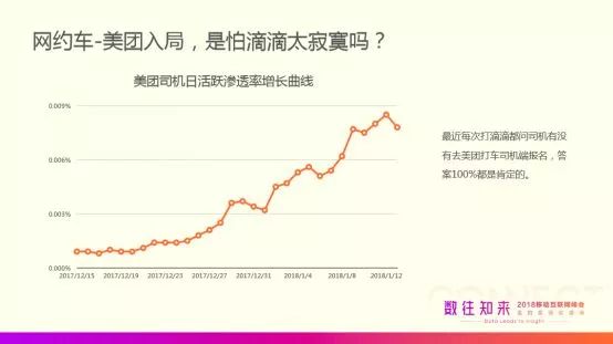 去年年底,美团正式加入网约车战局,这一举动令本已尘埃落定的网约车市场多了许多变数,市场大有“擦抢走火”的态势。猎豹大数据监测显示,从2017年12月15日到2018年1月12日,美团打车整体活跃渗透率不高,但是它的走势非常健康。