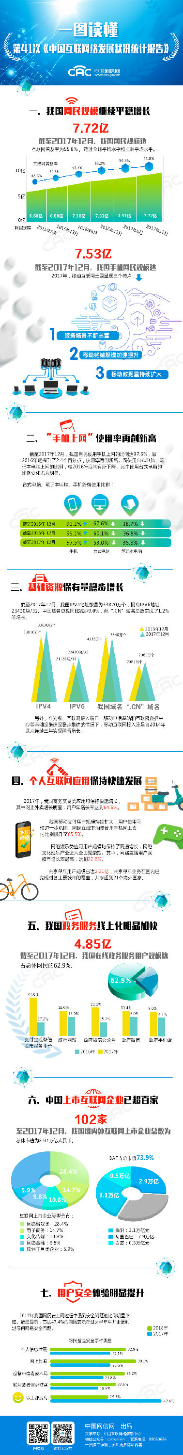 1月31日,中国互联网络信息中心(CNNIC)在京发布第41次《中国互联网络发展状况统计报告》(以下简称为《报告》)。截至2017年12月,我国网民规模达7.72亿,普及率达到55.8%,超过全球平均水平(51.7%)4.1个百分点,超过亚洲平均水平(46.7%)9.1个百分点。我国网民规模继续保持平稳增长,互联网模式不断创新、线上线下服务融合加速以及公共服务线上化步伐加快,成为网民规模增长推动力。