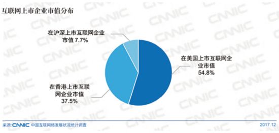 根据中国互联网络信息中心CNNIC最新发布的《第41次中国互联网络发展状况统计报告》数据,截至2017年12月底,我国境内外互联网上市企业数量达到102家,总体市值为8.97万亿人民币。其中,在沪深、美国和香港上市企业的数量分别为46家、41家和15家。