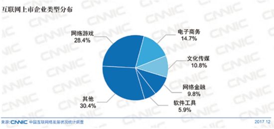 中国互联网上市企业中,网络游戏类企业最多,占28.4%;电子商务、文化传媒、网络金融和软件工具类企业分别占总数的14.7%、10.8%、9.8%、5.9%。中国网络游戏产业发展迅速,成为中国互联网行业的重要组成部分;垂直类电子商务企业与平台类电子商务企业正在形成差异化的发展道路;网络金融行业发展迅速,各类创新的理财形式不断推出。