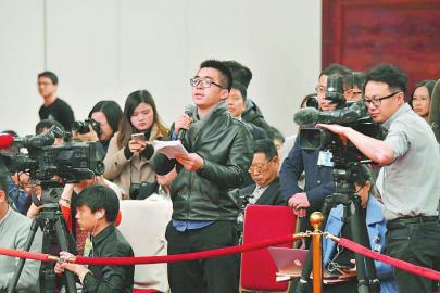 3月8日上午,四川代表团开放日,媒体记者正在向代表们提问。(记者 毛漫丁 摄)