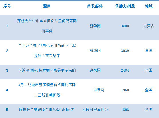 新华网炫知传播力分析系统显示,今日互联网传播力前五名分别是: