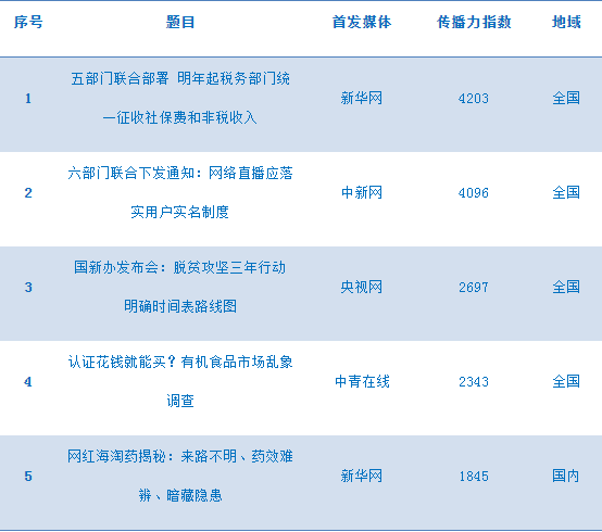 新华网炫知传播力分析系统显示,今日互联网传播力前五名分别是: