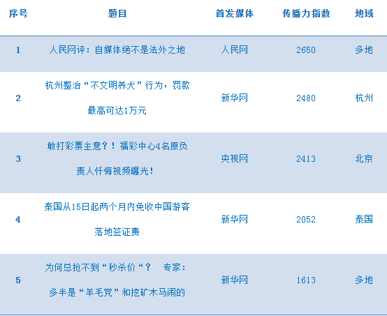 新华网炫知传播力分析系统显示,今日互联网传播力前五名分别是: