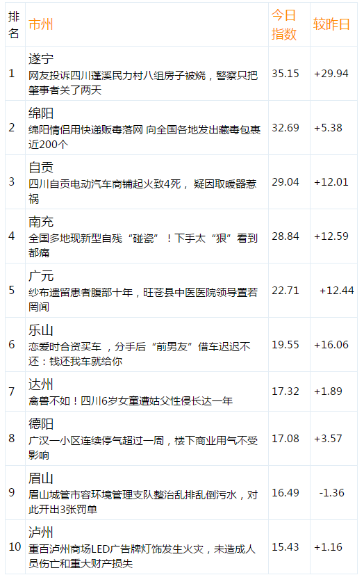 ※本文列举了今日指数最高的10个地区,同时列举了今日指数较昨日的涨跌值,以及时段内的主要敏感新闻或信息。