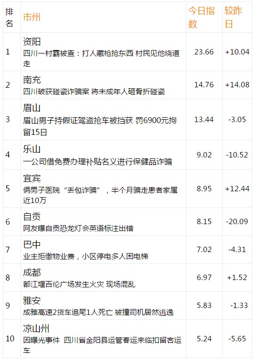 ※本文列举了今日指数最高的10个地区,同时列举了今日指数较昨日的涨跌值,以及时段内的主要敏感新闻或信息。