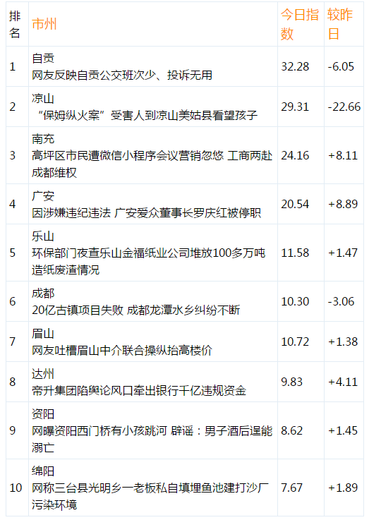 ※本文列举了今日指数最高的10个地区,同时列举了今日指数较昨日的涨跌值,以及时段内的主要敏感新闻或信息。