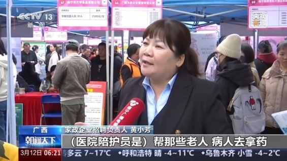 家政企业招聘负责人 黄小芳:(医院陪护员是)帮那些老人、病人之类的去拿药、取洗单子之类的,挂号之类的这样的一个工作。